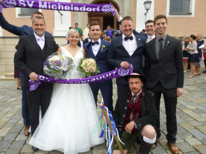 lilafarbenen Vereinsschals und bunten Seifenblasen. Schließlich ist der Bräutigam aktiver